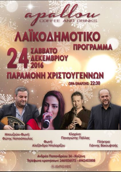 Λαϊκοδημοτικό πρόγραμμα στο “Apallou” στην Κοζάνη το Σάββατο 24 Δεκεμβρίου .