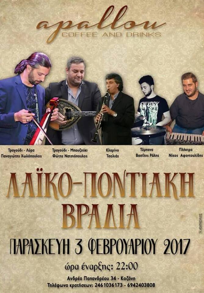Λαϊκή-Ποντιακή βραδιά στο “Apallou” στην Κοζάνη, την Παρασκευή 3 Φεβρουαρίου .