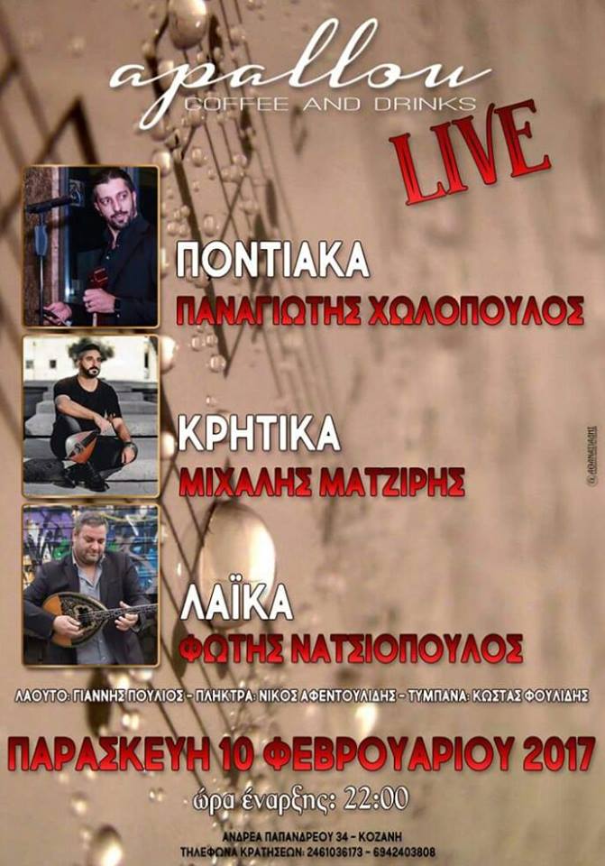 Ποντιακή, κρητική και λαϊκή βραδιά Live στο apallou bar στην Κοζάνη, την Παρασκευή 10 Φεβρουαρίου .