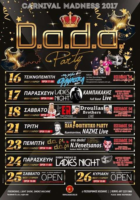 Carnival madness @ D.a.d.a. club στην Κοζάνη 16-26 Φεβρουαρίου