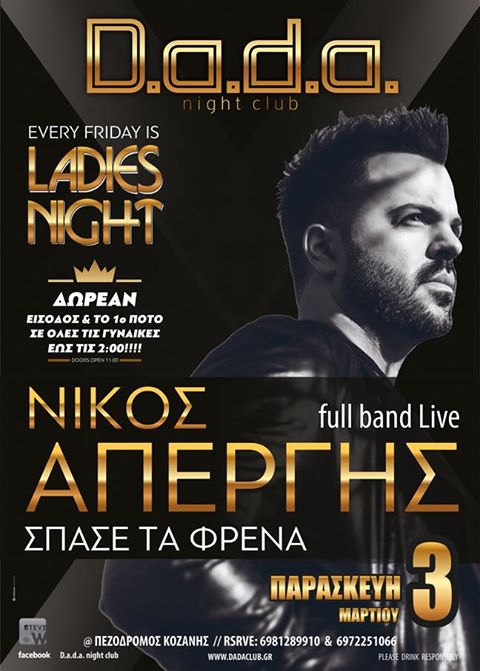 Ο Νίκος Απέργης Live στο club D.a.d.a. στην Κοζάνη, την Παρασκευή 3 Μαρτίου