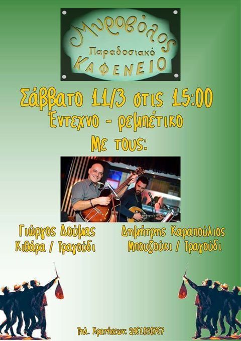 Έντεχνο ρεμπέτικο Live στο παραδοσιακό καφενείο “Μυροβόλος” στην Κοζάνη, το μεσημέρι του Σαββάτου 11 Μαρτίου.
