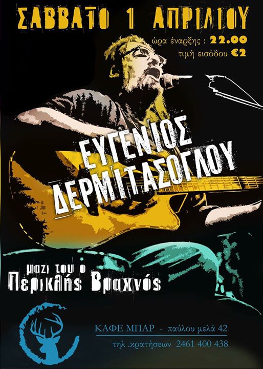 Ο Ευγένιος Δερμιτάσογλου στο Μπλέ Ελάφι στην Κοζάνη !Σαν ψέμματα… το Σάββατο 1 Απριλίου.Ο Ευγένιος Δερμιτάσογλου σε νέες περιπέτειες. Μαζίτου ο Περικλής Βραχνός στο Βιολί.Πειραματισμοί, instrumental, ρεμπέτικα Blues, folk προσεγγίσεις, τζάμια – Κρύσταλλα του νου, έως Ράδια σκούρα ανοιχτά τίγκα… …και πιο πέρα, με πολύ τραγούδι κι αυτοσχεδιασμούς.Με μουσικές από το χθες, το σήμερα αλλά και απ’ το μέλλον…Ένα ιδιαίτερο πρόγραμμα, παρουσιάζει ο Θεσσαλονικιός κιθαρωδός Βασισμένος στα πιο παραδοσιακά μπαλαντολαϊκά του τζαζ περάσματα & τις ροκιές του ως τροβαδούρος…Από τις μουσικές του γειτονιές, στις γειτονιές όλου του κόσμου.Σ’ ένα εργοτάξιο εξαιρετικών +αισθημάτων… με νέα τραγούδια απ’ τον δίσκο που θα κυκλοφορήσειΜε ατόφιες ηλεκτρικό-ακουστικές μπαλάντες, Αντάρτικα rock n’ roll, Κρητικά blues & Ελληνικά Λαϊκά Φλαμένκο…