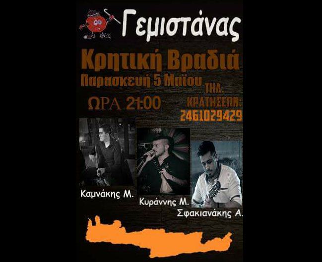Κρητική βραδιά στο μεζεδοπωλείο Γεμιστάνας στην Κοζάνη, την Παρασκευή 5 Μαΐου