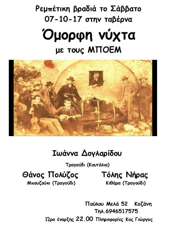 Ρεμπέτικη βραδιά στην “Όμορφη Νύχτα” στην Κοζάνη, το Σάββατο 7 Οκτωβρίου ..