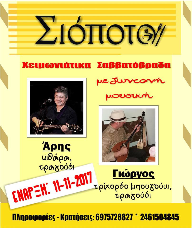 Καλό φαγητό, ζεστή ατμόσφαιρα δίπλα στ΄ αναμμένο τζάκι, και ο Άρης με τον Γιώργο με τα όμορφα τραγούδια τους θα μας κρατάνε συντροφιά τα χειμωνιάτικα Σαββατόβραδα. Πληροφορίες – κρατήσεις : 6975728827 – 2461504845