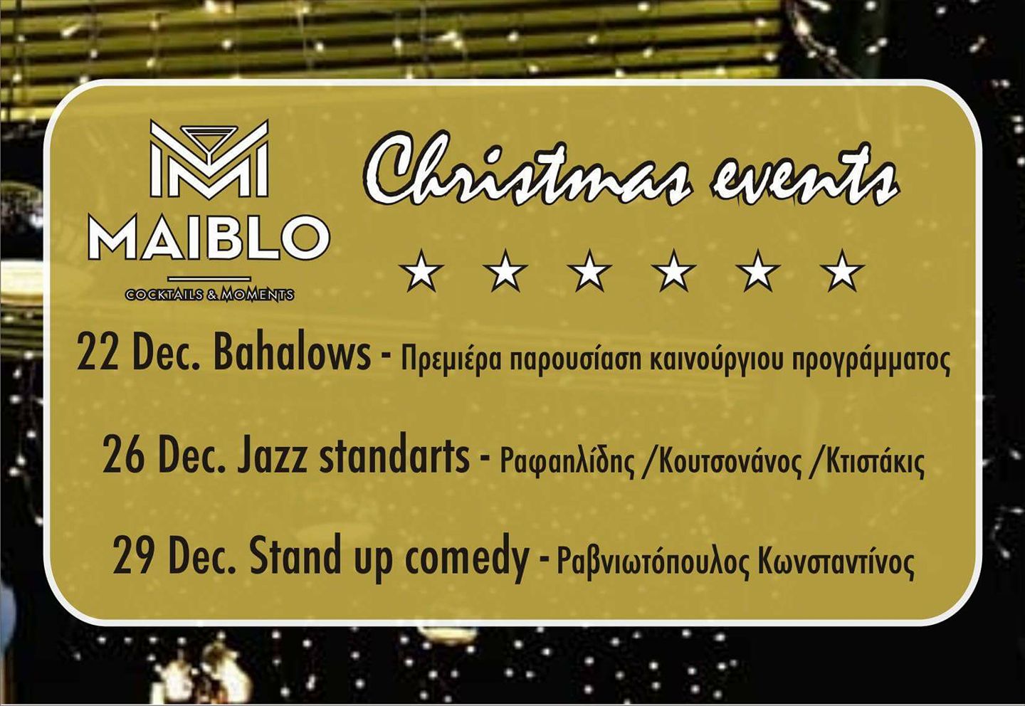 Christmas event στο Maiblo bar στην Κοζάνη, με τους Bahalows22/12, Jazz standarts 26/12, Stand up comedy 29/12