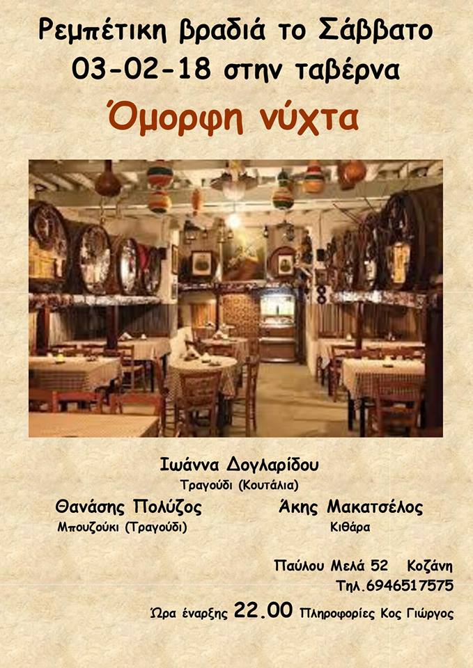Ρεμπέτικη βραδιά στην “Όμορφη νύχτα” στην Κοζάνη, το Σάββατο 3 Φεβρουαρίου .