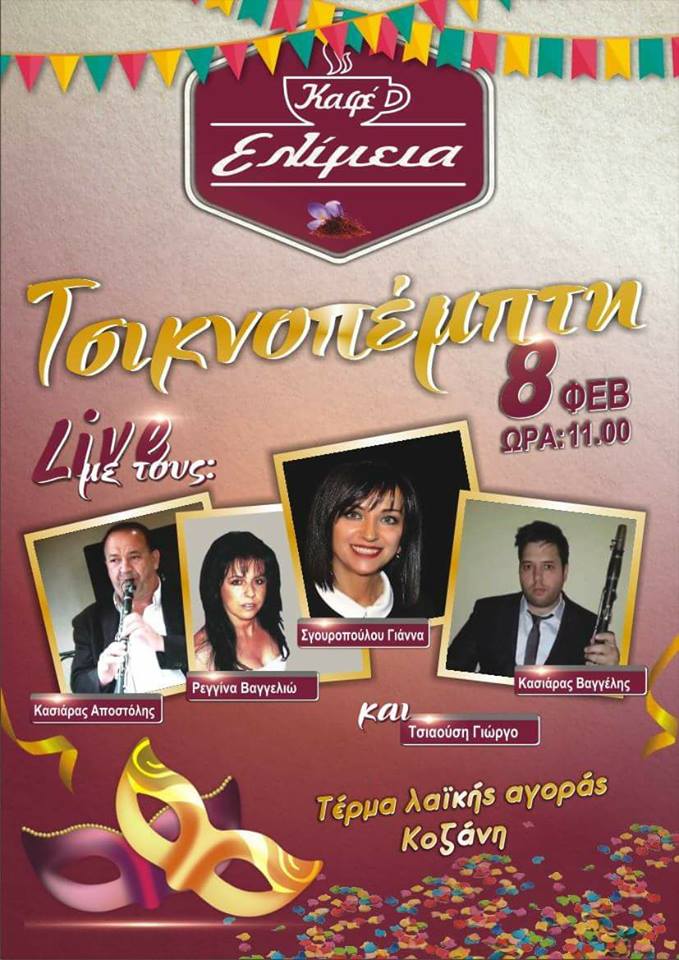 Αποκριάτικο γλέντι με ζωντανή μουσική, στο καφέ Ελίμεια στην Κοζάνη, την Τσικνοπέμπτη .