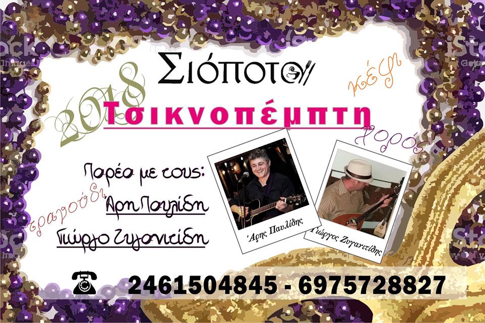 Την Τσικνοπέμπτη 8-2-2018 σας περιμένουμε να γιορτάσουμε μαζί την έναρξη της αποκριάς με φαγητό, ποτό και ζωντανή μουσική, για μια ξεχωριστή βραδιά με κέφι, τραγούδι και πολύ χορό. Τηλ. 2461504845 – 6975728827.