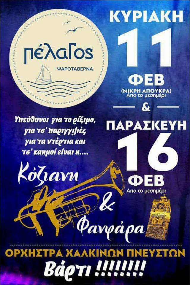 Γλέντι με χάλκινα στην ψαροταβέρνα Πέλαγος στην Κοζάνη, την Κυριακή 11 Φεβρουαρίου & την Παρασκευή 16 Φεβρουαρίου .