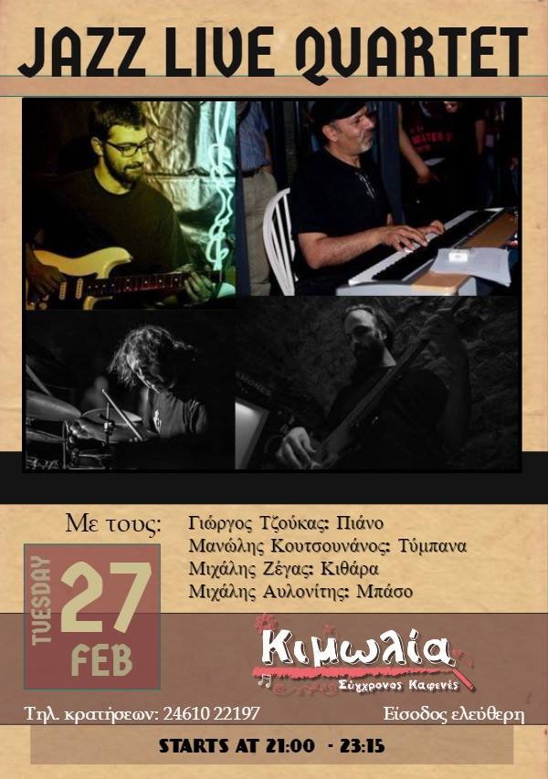 Jazz live quartet στον καφενέ Κιμωλία στην Κοζάνη, την Τρίτη 27 Φεβρουαρίου .
