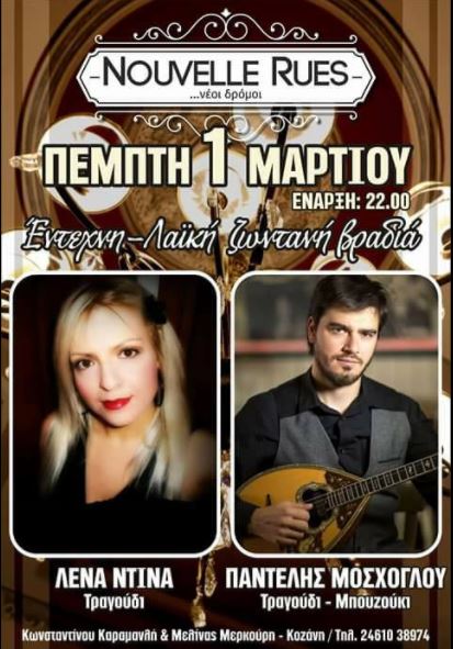 Έντεχνη λαϊκή ζωντανή βραδιά στο Nouvelle Rues στην Κοζάνη, την Πέμπτη 1 Μαρτίου .