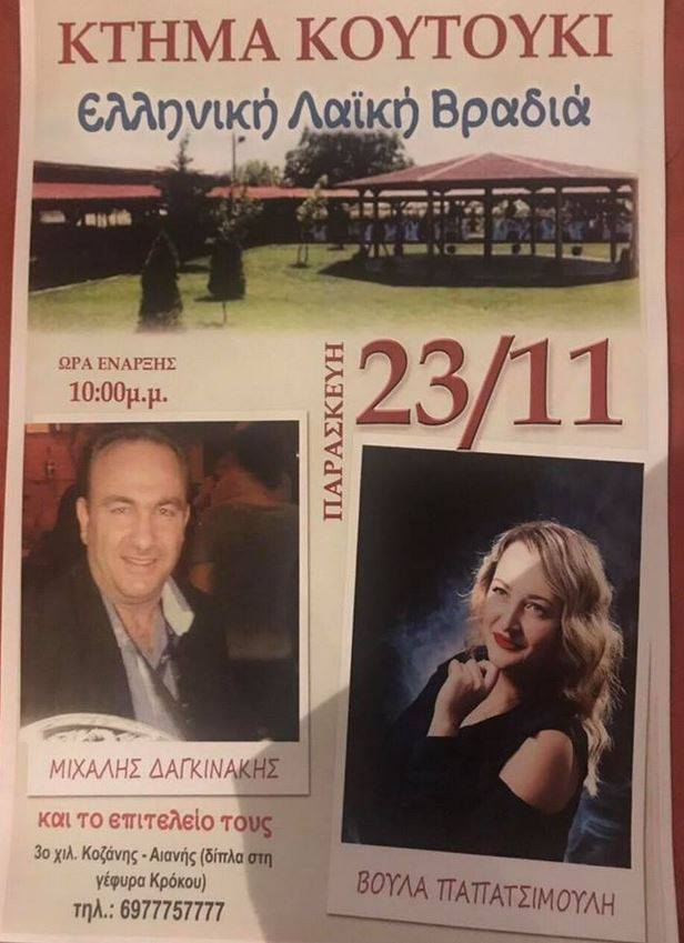 Ελληνική λαϊκή βραδιά στο “Κτήμα Κουτούκι”, την Παρασκευή 23 Νοεμβρίου .