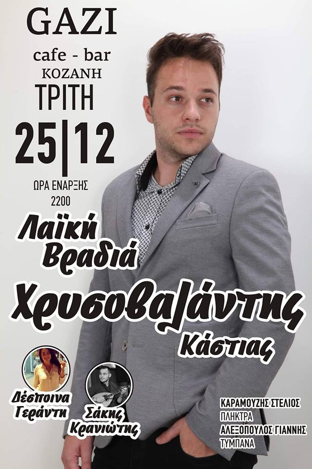 Λαϊκή βραδιά, στο Gazi cafe bar, στην Κοζάνη, με τον Χρυσοβαλάντη Κάστια, την Τρίτη 25 Δεκεμβρίου .